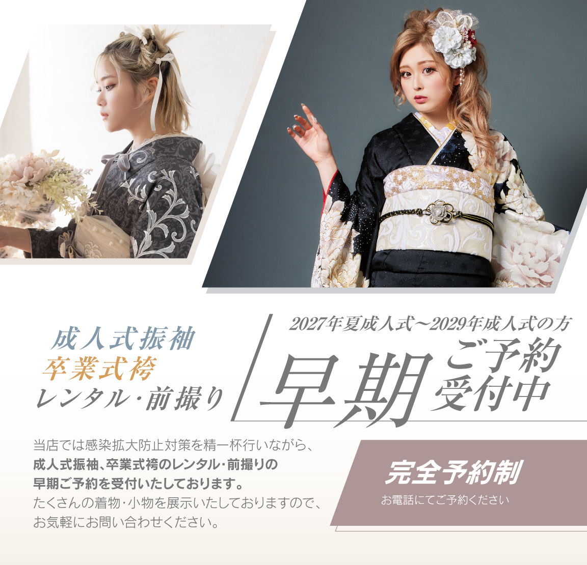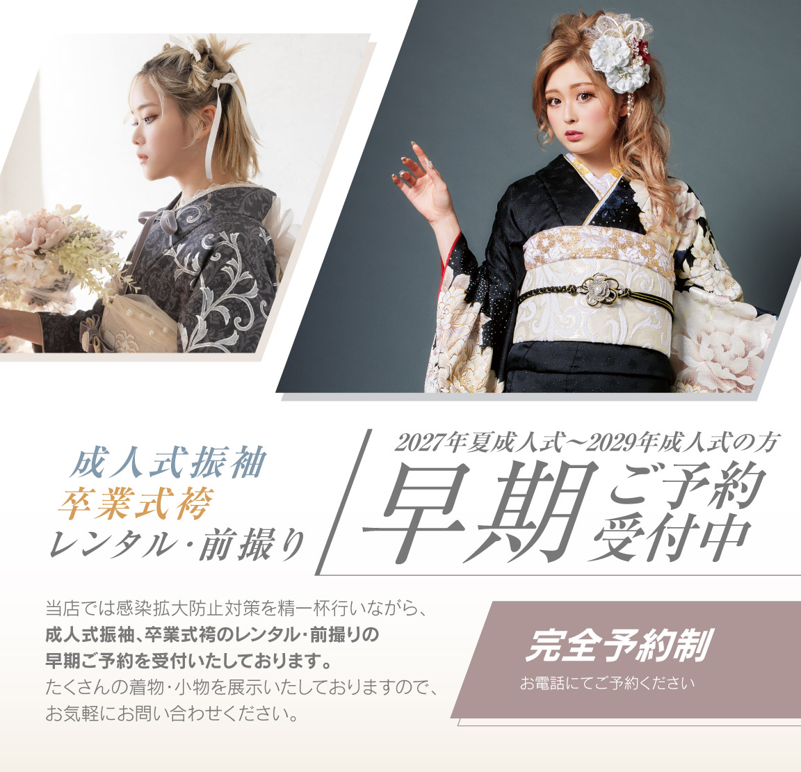 完全予約制の為、ご来店希望の方はご来店日をお電話にてご予約お願いいたします。2027年夏〜2029年成人式の方向けのお振袖の新作が続々入荷しておりますのでぜひお待ちしております。