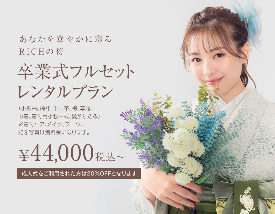 RICHの特徴は、ヘアセット・メイク・着付・前撮り撮影を全て店内で行えますので当日は手ぶらでOK!また、振袖・黒留袖・訪問着・卒業式袴セット他、和装小物の種類・サイズも豊富に取り揃えております。まずはお気軽にご相談ください。